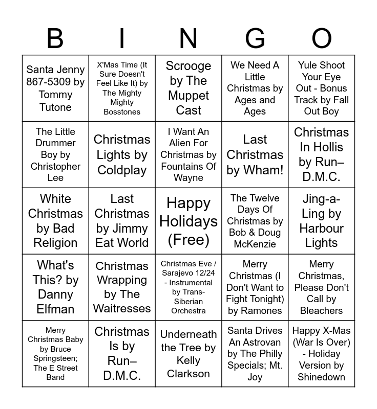 This bingo card has a free space and 38 words: Fairytale of New York (feat. Kirsty MacColl) by The Pogues; Kirsty MacColl, I Won't Be Home For Christmas by blink-182, She Won't Be Home by Erasure, Christmas Lights by Coldplay, Merry Christmas, Please Don't Call by Bleachers, Christmas Wrapping by The Waitresses, I Want An Alien For Christmas by Fountains Of Wayne, Everything's Gonna Be Cool This Christmas by Eels, Yule Shoot Your Eye Out - Bonus Track by Fall Out Boy, Last Christmas by Wham!, Last Christmas by Jimmy Eat World, We Need A Little Christmas by Ages and Ages, Happy X-Mas (War Is Over) - Holiday Version by Shinedown, Jing-a-Ling by Harbour Lights, The Little Drummer Boy by Christopher Lee, What's This? by Danny Elfman, It Feels Like Christmas by Ghost of Christmas Present, Scrooge by The Muppet Cast, The Chanukah Song by Adam Sandler, The Twelve Days Of Christmas by Bob & Doug McKenzie, Santa Jenny 867-5309 by Tommy Tutone, Christmas Is by Run–D.M.C., Christmas In Hollis by Run–D.M.C., Merry Christmas Baby by Bruce Springsteen; The E Street Band, Christmas All Over Again by Tom Petty and the Heartbreakers, Underneath the Tree by Kelly Clarkson, Santa, Can’t You Hear Me by Kelly Clarkson; Ariana Grande, Christmas C’mon by Lindsey Stirling; Becky G, Carol Of The Bells by Lindsey Stirling, A Mad Russian's Christmas - Instrumental by Trans-Siberian Orchestra, Wizards in Winter - Instrumental by Trans-Siberian Orchestra, Christmas Eve / Sarajevo 12/24 - Instrumental by Trans-Siberian Orchestra, Santa Drives An Astrovan by The Philly Specials; Mt. Joy, X'Mas Time (It Sure Doesn't Feel Like It) by The Mighty Mighty Bosstones, Wonderful Christmastime - Edited Version / Remastered 2011 by Paul McCartney, Merry Christmas (I Don't Want to Fight Tonight) by Ramones, White Christmas by Bad Religion and Father Christmas by The Kinks.