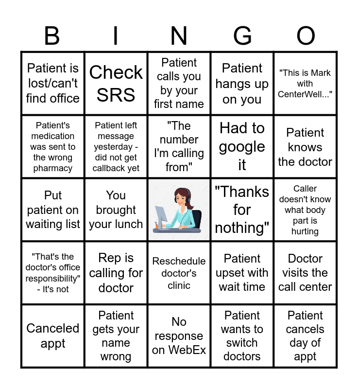 This bingo card has a free space and 93 words: "We don't see for that body part", VA checking on more than 3 patients, No response on WebEx, Patient is running late, FX - offered sooner appt, Consult to Brandy, "I just missed their call", Canceled appt, "Is my MRI scheduled?", Patient upset when they cannot speak with doctor/ nurse immediately, Patient asks for front desk, Patient only gives first name, Patient only gives last name, Had to google it, Earliest appt in too early, "This is Mark with CenterWell...", Patient calls you by your first name, Asked for Plan-of-Care, Patient says they don't need a referral - they do, "I want to speak with a manager", Asked for doctor's note, ShareCare Stuff, Jennifer says "I'm cold", Dr. Stone patient, Rep is calling for doctor, Patient left message yesterday - did not get callback yet, Transferred problem patient to someone else, Phone - Tech problems, You find a scheduling error, "Do y'all trim toenails?", Patient gets your name wrong, Reschedule doctor's clinic, Rude patient, Patient is eating on the call, Check SRS, Parent calling for ADULT patient, Caught the Shred-Guy!, "I want to make a complaint", "The number I'm calling from", Patient upset with wait time, Put patient on waiting list, "That's the doctor's office responsibility" - It's not, Caller doesn't know what body part is hurting, Dentist office calling, Patient cancels day of appt, We are not "The Orthopedic Group", Someone says "It's too hot", Claire says "Words", "That far out?" for doctors appt, Patient has bad debt, Call over 10 mins, Patient wants to switch doctors, Check BEG referral, Called looking for a job, Sent patient to Armstrong & Assoc, Kirby visits the call center, Patient is calling on doctor line, Had to speak with the doctor's team, Reschedule appt, Reschedule MRI, You brought your lunch, You drank a bottle of water, Schedule same day appt, "What doctor's office is this", "I'm going out of town", Patient went to wrong office, Received a compliment from patient, "I have a very important job", Patient's medication was sent to the wrong pharmacy, Can't hear caller, Medication refill, "I paid my outstanding balance", Check Medicaid Referral, Patient hangs up on you, "Is my injection scheduled?", Brandy says "Buh-Bye", Patient knows the doctor, Doctor visits the call center, Pharmacy calling, MyChart issues, Spouse/family member speaks for patient, DME problems, "Thanks for nothing", Patient is lost/can't find office, Patient tells you their life story, Patient crying, Saraland or Mobile calling Baldwin County, Had to call IT, "It's not WC" - It is, We're here on vacation, Transfer to WC, Baby screaming in background and Dog barking in background.