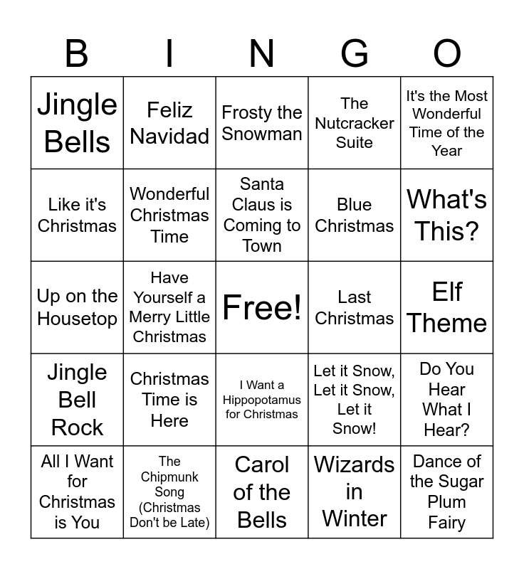 This bingo card has a free space and 34 words: Rockin' Around the Christmas Tree, Wizards in Winter, You're a Mean One Mr. Grinch, Silver Bells, Jingle Bell Rock, Wonderful Christmas Time, It's the Most Wonderful Time of the Year, All I Want for Christmas is You, Feliz Navidad, Winter Wonderland, Santa Claus is Coming to Town, Frosty the Snowman, Rudolph the Red Nosed Reindeer, The Polar Express Theme, Last Christmas, What's This?, The Chipmunk Song (Christmas Don't be Late), Up on the Housetop, Christmas Time is Here, Let it Snow, Let it Snow, Let it Snow!, I Want a Hippopotamus for Christmas, Greatest Time of Year, Jingle Bells, Elf Theme, Carol of the Bells, Dance of the Sugar Plum Fairy, The Nutcracker Suite, White Christmas, Blue Christmas, Like it's Christmas, Santa Tell Me, Have Yourself a Merry Little Christmas, Do You Hear What I Hear? and The Christmas Song (Chestnuts Roasting on an Open Fire).