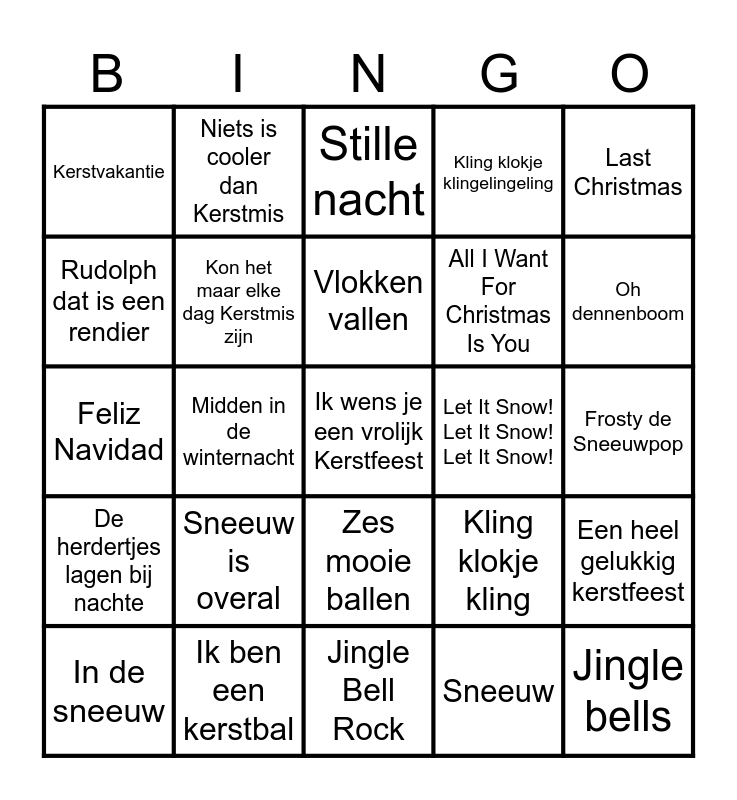 This bingo card has a free space and 24 words: Sneeuw is overal, Ik ben een kerstbal, Vlokken vallen, In de sneeuw, Last Christmas, Kerstvakantie, Rudolph dat is een rendier, Niets is cooler dan Kerstmis, Let It Snow! Let It Snow! Let It Snow!, Zes mooie ballen, All I Want For Christmas Is You, Feliz Navidad, Kling klokje kling, Een heel gelukkig kerstfeest, Kon het maar elke dag Kerstmis zijn, Sneeuw, Frosty de Sneeuwpop, Stille nacht, Oh dennenboom, Midden in de winternacht, Jingle bells, De herdertjes lagen bij nachte, Kling klokje klingelingeling and Jingle Bell Rock.