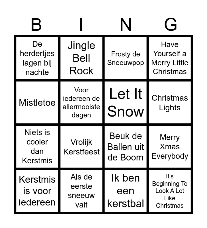 This bingo card has 34 words: Last Christmas, All I Want For Christmas Is You, Feliz Navidad, Santa Tell Me, It’s Beginning To Look A Lot Like Christmas, Let It Snow, Mistletoe, Underneath the Tree, Jingle Bell Rock, Do They Know It’s Christmas, Christmas Lights, Frosty de Sneeuwpop, Rudolf dat is een rendier, Ik wens je een vrolijk Kerstfeest, Als de eerste sneeuw valt, Vrolijk Kerstfeest, Zou niet willen dat ik Kerst mis, Beuk de Ballen uit de Boom, Flappie, Santa Claus Is Comin’ to Town, It’s the Most Wonderful Time of the Year, Shake Up Christmas, De herdertjes lagen bij nachte, Ik ben een kerstbal, Santa Baby, Kerstmis is voor iedereen, Have Yourself a Merry Little Christmas, Midden in de Winternacht, Niets is cooler dan Kerstmis, Voor iedereen de allermooiste dagen, Kerstfeest met elkaar, Merry Xmas Everybody, Kerst zonder jou and Happy New Year.