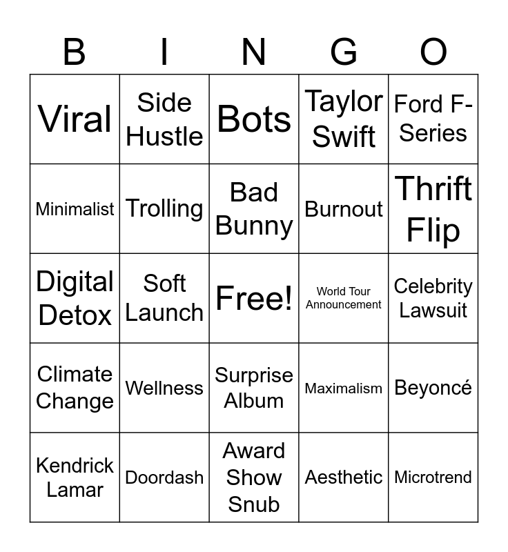 This bingo card has a free space and 30 words: Doordash, Main Character Era, Soft Launch, Cancelled, Viral, Bots, Trolling, Surprise Album, World Tour Announcement, Award Show Snub, Celebrity Lawsuit, Microtrend, Aesthetic, Vintage, Thrift Flip, Quiet Luxury, Maximalism, Climate Change, Wellness, Ford F-Series, Digital Detox, Work-Life, Side Hustle, Burnout, Minimalist, Taylor Swift, Beyoncé, Kendrick Lamar, Bad Bunny and Jalen Hurts.