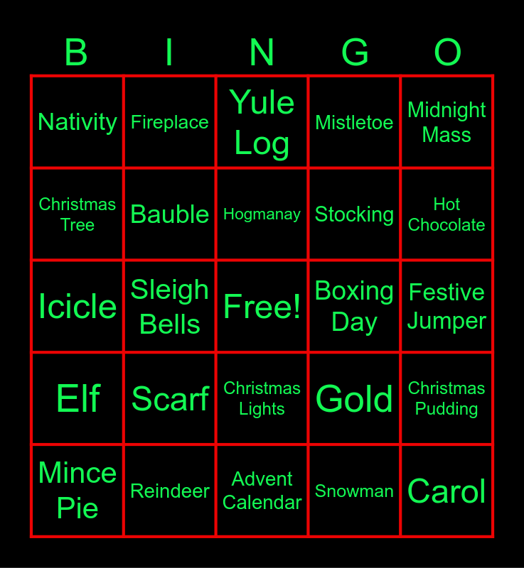 This bingo card has a free space and 60 words: Santa, Reindeer, Sleigh, Elf, Snowman, Snowflake, Bauble, Tinsel, Stocking, Holly, Mistletoe, Wreath, Christmas Tree, Star, Angel, Nativity, Carol, Midnight Mass, Pantomime, Hogmanay, Boxing Day, Yule Log, Mince Pie, Christmas Pudding, Gingerbread, Candy Cane, Mulled Wine, Eggnog, Hot Chocolate, Crackers, Wrapping Paper, Ribbon, Present, Gift Tag, Fireplace, Chimney, North Pole, Sleigh Bells, Frost, Icicle, Snowball, Scarf, Festive Jumper, Glitter, Gold, Frankincense, Myrrh, Partridge, Turtledoves, Christmas Lights, Advent Calendar, Candy Selection, Tree Topper, Snow Globe, Gingerbread House, Santa Hat, Reindeer Antlers, Christmas Card, Festive Playlist and Holiday Cheer.