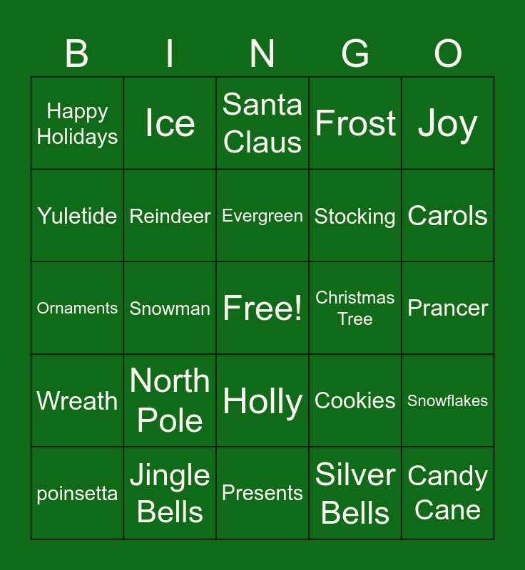 This bingo card has a free space and 29 words: poinsetta, mistletoe, Snowman, Christmas, Happy Holidays, Santa Claus, Reindeer, North Pole, Christmas Tree, Jingle Bells, Prancer, Candy Cane, Presents, Silver Bells, Carols, Sleigh, Holly, Wreath, Joy, Ornaments, Cookies, Elves, Stocking, Yuletide, Frost, Ice, Snowflakes, Evergreen and Tinsel.
