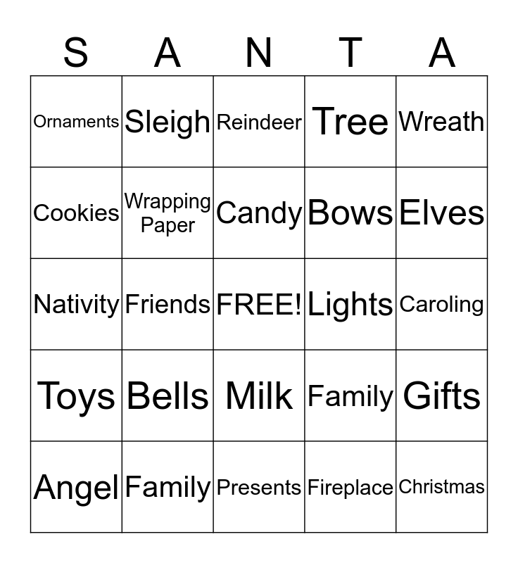 This bingo card has a free space and 50 words: Santa, Christmas, Elves, Presents, Bells, Reindeer, Sleigh, Milk, Cookies, Comet, Wrapping Paper, Tree, Gifts, Family, Ribbon, Snow, Candy, Lights, Snowman, Wreath, Friends, Fireplace, Ornaments, Bows, Santa, Christmas, Elves, Presents, Reindeer, Milk, Cookies, Tree, Ornaments, Rudolph, Family, Snow, Lights, Snowman, Wreath, Caroling, Mistletoe, Sleigh, Frosty, Nutcracker, Angel, Nativity, Scrooge, Stocking, Toys and Deck the Halls.