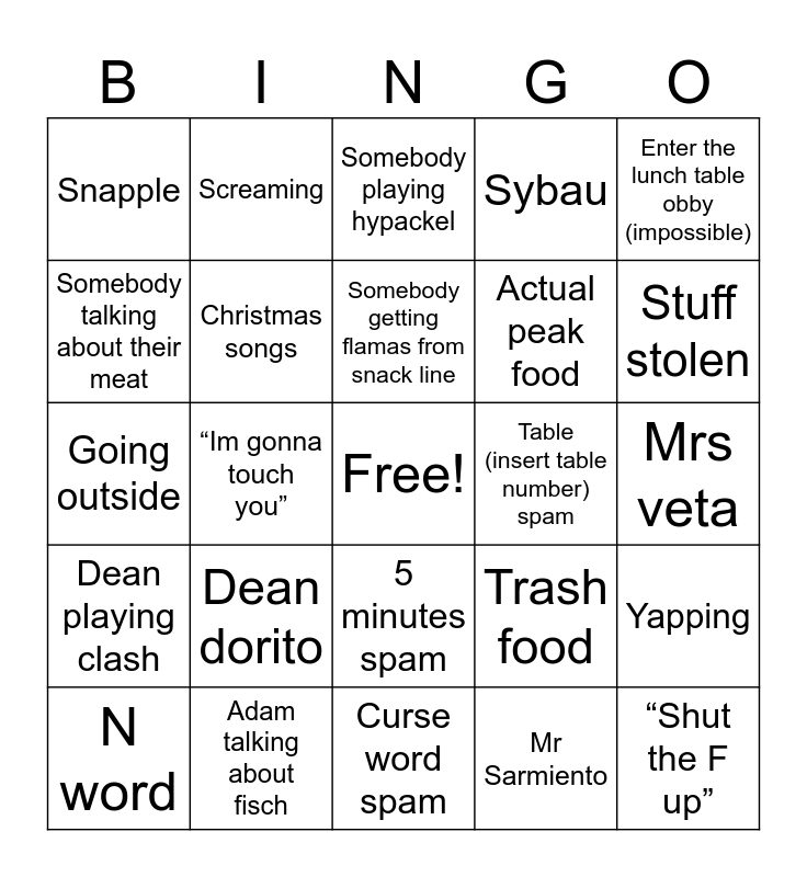 This bingo card has a free space and 24 words: Dean dorito, Adam talking about fisch, Somebody getting flamas from snack line, N word, Enter the lunch table obby (impossible), Snapple, Somebody talking about their meat, Screaming, Table (insert table number) spam, 5 minutes spam, Actual peak food, Going outside, Trash food, Yapping, Christmas songs, Mr Sarmiento, Mrs veta, Somebody playing hypackel, Stuff stolen, “Im gonna touch you”, “Shut the F up”, Dean playing clash, Sybau and Curse word spam.