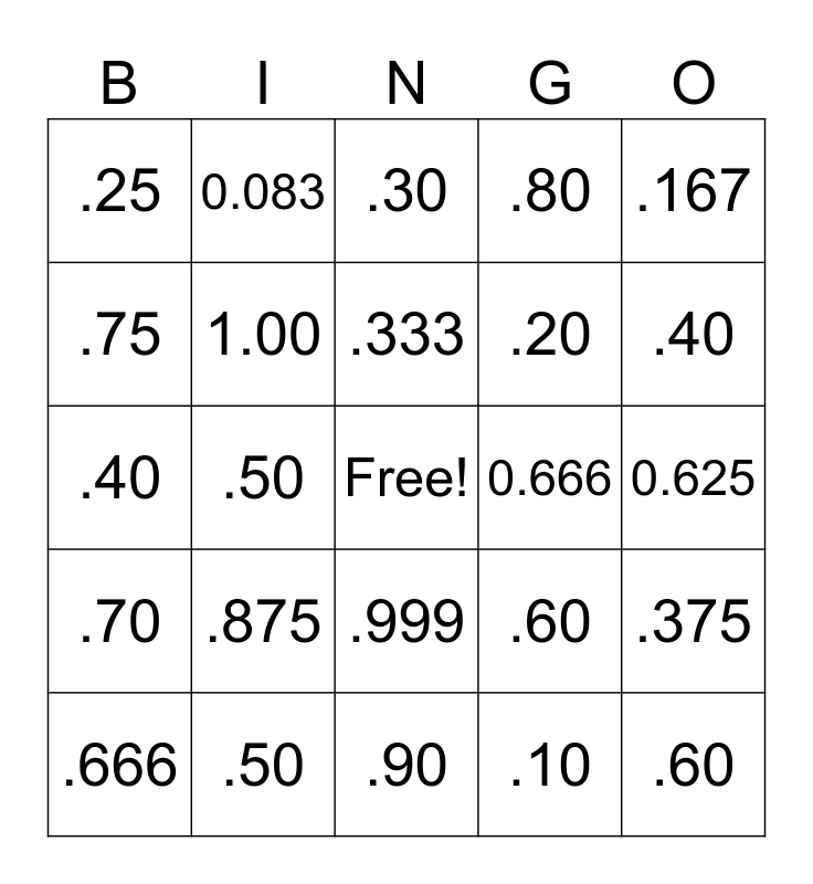 This bingo card has a free space and 24 words: .875, .50, .333, .666, .167, .25, .75, 0.083, 0.666, .999, .20, .40, .60, .375, 1.00, .10, 0.625, .30, .40, .50, .60, .70, .80 and .90.