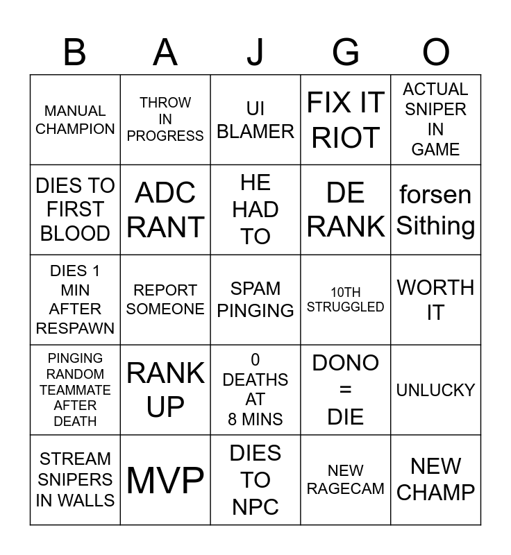 This bingo card has 25 words: RANK UP, DIES TO NPC, HE HAD TO, STREAM SNIPERS IN WALLS, ACTUAL SNIPER IN GAME, MANUAL CHAMPION, DIES TO FIRST BLOOD, THROW IN PROGRESS, 10TH STRUGGLED, 0 DEATHS AT 8 MINS, DE RANK, DIES 1 MIN AFTER RESPAWN, DONO = DIE, UNLUCKY, ADC RANT, NEW CHAMP, WORTH IT, UI BLAMER, forsen Sithing, REPORT SOMEONE, SPAM PINGING, MVP, PINGING RANDOM TEAMMATE AFTER DEATH, FIX IT RIOT and NEW RAGECAM.