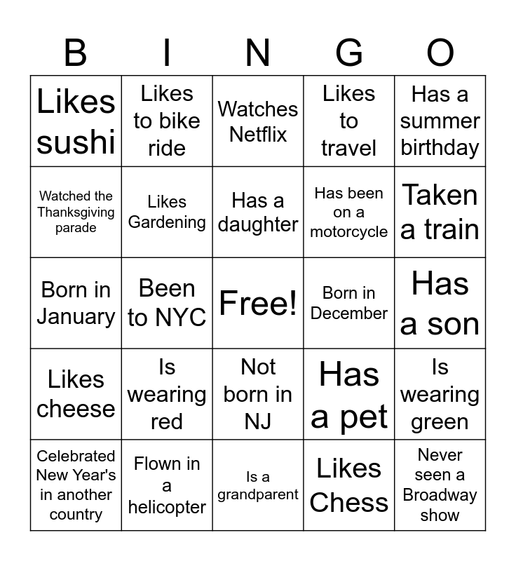 This bingo card has a free space and 29 words: Celebrated New Year's in another country, Is wearing glasses, Been to NYC, Likes to bake, Likes sushi, Watches Netflix, Likes Gardening, Is wearing red, Born in December, Flown in a helicopter, Has a son, Never seen a Broadway show, Is a grandparent, Likes Chess, Taken a train, Plays an instrument, Not born in NJ, Likes cheese, Has a summer birthday, Born in January, Has a pet, Speaks 3 or more languages, Has been on a motorcycle, Watched the Thanksgiving parade, Likes to travel, Likes to bike ride, Is wearing green, Has a daughter and Shoveled snow last weekend.
