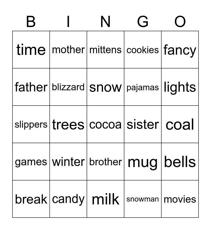This bingo card has a free space and 24 words: winter, candy, snow, break, fancy, time, father, mother, sister, brother, pajamas, slippers, mug, bells, blizzard, snowman, coal, mittens, lights, trees, movies, games, cookies and milk.