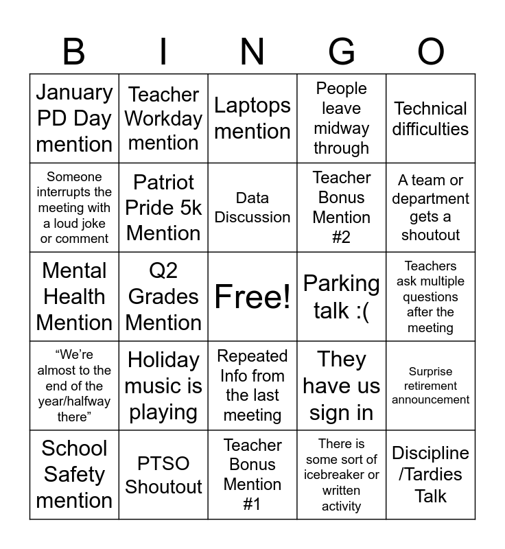 This bingo card has a free space and 24 words: Holiday music is playing, PTSO Shoutout, Data Discussion, School Safety mention, Technical difficulties, January PD Day mention, Someone interrupts the meeting with a loud joke or comment, Teacher Workday mention, Parking talk :(, Repeated Info from the last meeting, Teacher Bonus Mention #2, Mental Health Mention, They have us sign in, Surprise retirement announcement, Patriot Pride 5k Mention, There is some sort of icebreaker or written activity, Teachers ask multiple questions after the meeting, Laptops mention, A team or department gets a shoutout, Q2 Grades Mention, Discipline /Tardies Talk, “We’re almost to the end of the year/halfway there”, People leave midway through and Teacher Bonus Mention #1.