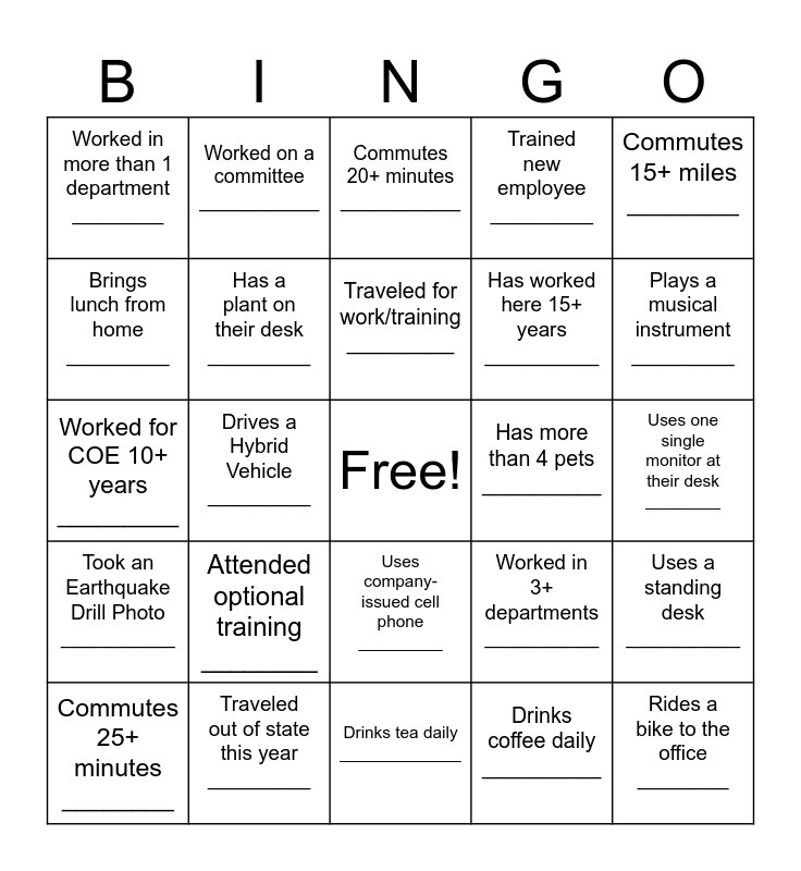 This bingo card has a free space and 24 words: Commutes 25+ minutes ________, Attended optional training ________, Traveled for work/training _________, Drinks coffee daily __________, Commutes 15+ miles ________, Worked in more than 1 department ________, Worked on a committee ___________, Commutes 20+ minutes ___________, Has more than 4 pets __________, Uses one single monitor at their desk ________, Worked for COE 10+ years _________, Has a plant on their desk _________, Worked in 3+ departments __________, Uses a standing desk __________, Brings lunch from home _________, Traveled out of state this year _________, Drinks tea daily _____________, Trained new employee _________, Plays a musical instrument _________, Took an Earthquake Drill Photo __________, Drives a Hybrid Vehicle _________, Uses company-issued cell phone _________, Has worked here 15+ years __________ and Rides a bike to the office ________.