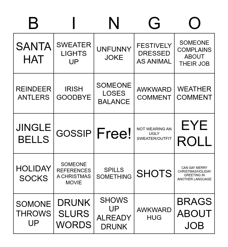 This bingo card has a free space and 24 words: SOMEONE REFERENCES A CHRISTMAS MOVIE, DRUNK SLURS WORDS, SOMEONE LOSES BALANCE, SOMONE THROWS UP, SOMEONE COMPLAINS ABOUT THEIR JOB, SANTA HAT, REINDEER ANTLERS, SWEATER LIGHTS UP, NOT WEARING AN UGLY SWEATER/OUTFIT, SPILLS SOMETHING, AWKWARD COMMENT, JINGLE BELLS, SHOTS, CAN SAY MERRY CHRISTMAS/HOLIDAY GREETING IN ANOTHER LANGUAGE, IRISH GOODBYE, AWKWARD HUG, EYE ROLL, UNFUNNY JOKE, WEATHER COMMENT, GOSSIP, BRAGS ABOUT JOB, HOLIDAY SOCKS, FESTIVELY DRESSED AS ANIMAL and SHOWS UP ALREADY DRUNK.