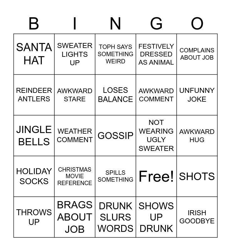 This bingo card has 25 words: CHRISTMAS MOVIE REFERENCE, DRUNK SLURS WORDS, LOSES BALANCE, THROWS UP, COMPLAINS ABOUT JOB, SANTA HAT, REINDEER ANTLERS, SWEATER LIGHTS UP, NOT WEARING UGLY SWEATER, SPILLS SOMETHING, AWKWARD COMMENT, JINGLE BELLS, Free!, SHOTS, AWKWARD STARE, IRISH GOODBYE, AWKWARD HUG, TOPH SAYS SOMETHING WEIRD, UNFUNNY JOKE, WEATHER COMMENT, GOSSIP, BRAGS ABOUT JOB, HOLIDAY SOCKS, FESTIVELY DRESSED AS ANIMAL and SHOWS UP DRUNK.