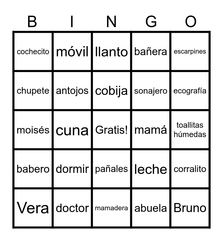 This bingo card has a free space and 24 words: dormir, doctor, cobija, Vera, escarpines, cochecito, chupete, móvil, mamá, pañales, sonajero, moisés, leche, corralito, antojos, abuela, toallitas húmedas, llanto, ecografía, cuna, Bruno, babero, bañera and mamadera.