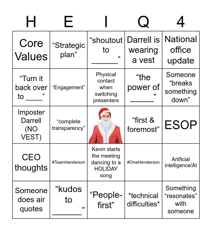 This bingo card has a free space and 34 words: Kevin explains how the song is relevant to the meeting, *technical difficulties*, “Building the pipeline”, “Innovation”, CEO thoughts, “Engagement”, National office update, Someone does air quotes, “Strategic plan”, “Client experience”, Physical contact when switching presenters, “shoutout to ______”, Something “speaks volumes” to someone/something, Kevin makes an analogy, “first & foremost”, Someone “breaks something down”, “kudos to ______”, Imposter Darrell (NO VEST), #TeamHenderson, #OneHenderson, Kevin starts the meeting dancing to a HOLIDAY song, “Vision & purpose”, Core Values, ESOP, “People-first”, Something “resonates” with someone, Darrell is wearing a vest, “_____ mindset”, “the power of _____”, “Turn it back over to ____”, Someone mentions BINGO, “complete transparency”, Artificial intelligence/AI and Kevin says “I love numbers”.