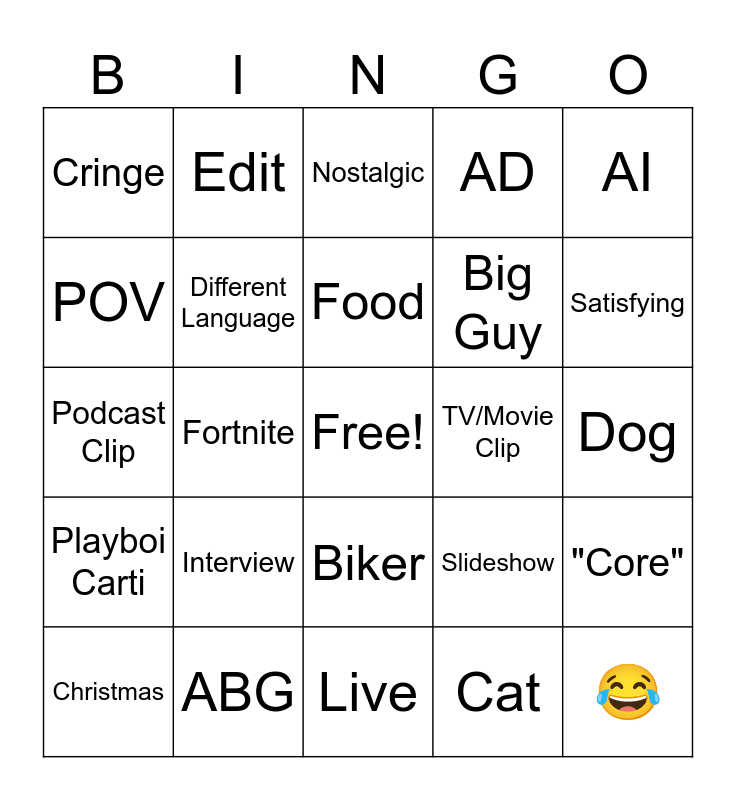 This bingo card has a free space and 24 words: Interview, ABG, Food, Christmas, AI, Cringe, POV, Edit, TV/Movie Clip, Biker, Big Guy, Podcast Clip, Slideshow, "Core", Different Language, Cat, Dog, Nostalgic, Satisfying, Fortnite, 😂, Playboi Carti, AD and Live.