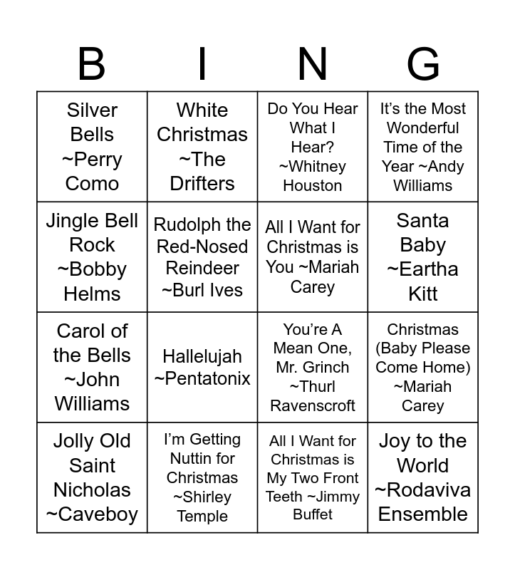 This bingo card has 50 words: Please Come Home for Christmas ~ Eagles, Jolly Old Saint Nicholas ~Caveboy, Up On the House Top ~Gene Autry, Underneath the Tree ~Kelly Clarkson, My Only Wish (This Year) ~Britney Spears, We Wish You A Merry Christmas ~Pentatonix, White Christmas ~The Drifters, Last Christmas ~Wham!, Rudolph the Red-Nosed Reindeer ~Burl Ives, Mele Kalikimaka ~Bing Crosby, All I Want for Christmas is You ~Mariah Carey, It’s the Most Wonderful Time of the Year ~Andy Williams, Winter Wonderland ~Michael Buble, Santa Claus Is Coming to Town ~The Jackson 5, Holly Jolly Christmas ~Michael Buble, Rockin’ Around the Christmas Tree ~Brenda Lee, Santa Baby ~Eartha Kitt, I’m Getting Nuttin for Christmas ~Shirley Temple, Run Rudolph Run ~Chuck Berry, Jingle Bell Rock ~Bobby Helms, Christmas (Baby Please Come Home) ~Mariah Carey, Sleigh Ride ~Andy Williams, Silver Bells ~Perry Como, Carol of the Bells ~John Williams, I Want a Hippopotamus for Christmas ~Gayla Peevey, Little Saint Nick ~The Beach Boys, Hallelujah ~Pentatonix, Blue Christmas ~Elvis Presley, Do You Hear What I Hear? ~Whitney Houston, Deck The Hall ~Nat King Cole, I Saw Mommy Kissing Santa Claus ~Perry Como, Merry Christmas, Happy Holidays ~*NSYNC, Have Yourself A Merry Little Christmas ~Sam Smith, Feliz Navidad ~Jose Feliciano, O Holy Night ~Perry Como, The Christmas Song ~Nat King Cole, Frosty the Snowman ~The Ronettes, What Christmas Means to Me ~98 Degree, Grandma Got Run Over by a Reindeer ~Elmo & Patsy, All I Want for Christmas is My Two Front Teeth ~Jimmy Buffet, Dónde Está Santa Claus? ~Augie Rios, God Rest Ye Merry Gentleman ~Pentatonix, It’s Beginning to Look a Lot like Christmas ~Bing Crosby, Santa Tell Me ~Ariana Grande, Here Comes Santa Claus ~Bing Crosby, You’re A Mean One, Mr. Grinch ~Thurl Ravenscroft, Happy Holiday/The Holiday Season ~Andy Williams, Mistletoe ~Justin Bieber, Joy to the World ~Rodaviva Ensemble and 12 Days of Christmas ~Pentatonix.
