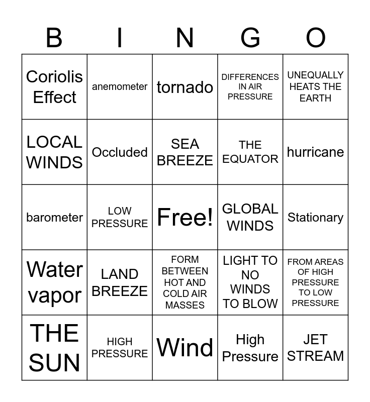 This bingo card has a free space and 24 words: LAND BREEZE, HIGH PRESSURE, SEA BREEZE, THE SUN, UNEQUALLY HEATS THE EARTH, Coriolis Effect, LOCAL WINDS, anemometer, GLOBAL WINDS, FORM BETWEEN HOT AND COLD AIR MASSES, THE EQUATOR, barometer, LIGHT TO NO WINDS TO BLOW, FROM AREAS OF HIGH PRESSURE TO LOW PRESSURE, Occluded, High Pressure, Stationary, tornado, hurricane, LOW PRESSURE, JET STREAM, Water vapor, DIFFERENCES IN AIR PRESSURE and Wind.