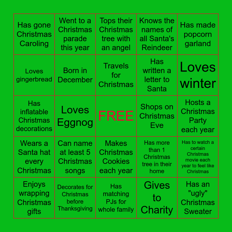 This bingo card has a free space and 35 words: Snoops for presents, Has a real tree, Loves Hallmark Christmas Movies, Born in December, Makes Christmas Cookies each year, Knows the names of all Santa's Reindeer, Loves gingerbread, Opens gifts on Christmas Eve, Travels for Christmas, Sends Christmas cards, Has inflatable Christmas decorations, Has made popcorn garland, Drives around to see Christmas lights, Christmas is their fave holiday, Has gone Christmas Caroling, Shops on Christmas Eve, Gives to Charity, Loves Eggnog, Wears a Santa hat every Christmas, Has an "ugly" Christmas Sweater, Has more than 1 Christmas tree in their home, Enjoys wrapping Christmas gifts, Has to watch a certain Christmas movie each year to feel like Christmas, Decorates for Christmas before Thanksgiving, Tops their Christmas tree with an angel, Loves winter, Has dressed up like Santa, Hates Christmas Music, Has written a letter to Santa, Hosts a Christmas Party each year, Thinks "Die Hard" movies are the best Christmas movies, Has matching PJs for whole family, Can name at least 5 Christmas songs, Went to a Christmas parade this year and Seen a live Nativity Scene.
