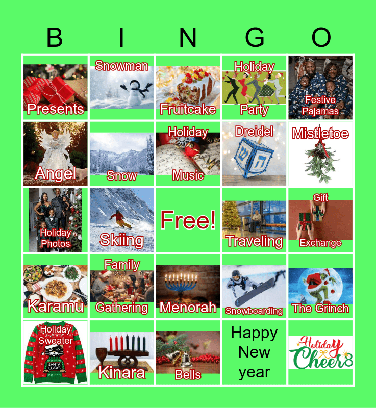 This bingo card has 74 images, a free space and 75 words: Holiday Cards, Fruitcake, Holiday Movies, Holiday Baking, Outdoor Decorations, Holiday Lights, Wish List, Candy Canes, Wreath, Fireplace, Holiday Party, Presents, Hot Cocoa, Angel, Stocking, Family Gathering, Eggnog, Gift Exchange, Gingerbread House, Festive Pajamas, Holiday Photos, Holiday Music, Snow, Winter, Scarf, Peppermint, Giving, North Pole, Mistletoe, Red, Bells, Traffic, Holiday Sweater, Traveling, Ornament, Holiday Socks, Snowflake, Poinsettia, Wrapping Paper, Ice Skating, Elf on a Shelf, Hallmark Movies, Snowman, Nutcracker, Candles, Ribbons and Bows, Luminarias, The Grinch, Skiing, Snowboarding, Sledding, Sleigh Ride, Christmas Tree, Christmas, Santa, Hanukkah, Menorah, Dreidel, Gelt, Las Posadas, Caroling, Diwali, Puja, Rangoli, Nguzo Saba, Karamu, Kinara, Piñata, Posole, Tamales, Merry Christmas, Happy New year, Happy Holiday, Family Love and Spread some love.