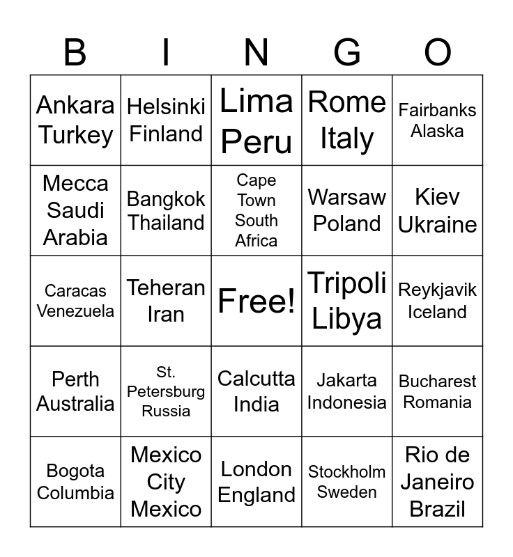 This bingo card has a free space and 39 words: Beijing China, Berlin Germany, Barcelona Spain, Bangkok Thailand, Bogota Columbia, Calcutta India, Cape Town South Africa, Dublin Ireland, Fairbanks Alaska, Perth Australia, Teheran Iran, Rome Italy, Rio de Janeiro Brazil, Reykjavik Iceland, Tripoli Libya, St. Petersburg Russia, Wellington New Zealand, Ankara Turkey, Cairo Egypt, Jakarta Indonesia, Mecca Saudi Arabia, London England, Warsaw Poland, Kiev Ukraine, Madrid Spain, Moscow Russia, Nairobi Kenya, Nuuk Greenland, Lisbon Portugal, Helsinki Finland, Havana Cuba, Hong Kong China, Lima Peru, Mexico City Mexico, Stockholm Sweden, Japan Tokyo, Bucharest Romania, Caracas Venezuela and Copenhagen Denmark.
