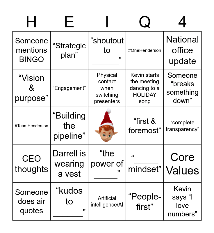 This bingo card has a free space and 33 words: Kevin explains how the song is relevant to the meeting, *technical difficulties*, “Building the pipeline”, “Innovation”, CEO thoughts, “Engagement”, National office update, Someone does air quotes, “Strategic plan”, “Client experience”, Physical contact when switching presenters, “shoutout to ______”, Something “speaks volumes” to someone/something, Kevin makes an analogy, “first & foremost”, Someone “breaks something down”, “kudos to ______”, #TeamHenderson, Darrell is wearing a vest, “_____ mindset”, “the power of _____”, “Turn it back over to ____”, Someone mentions BINGO, “complete transparency”, Artificial intelligence/AI, Kevin says “I love numbers”, #OneHenderson, Kevin starts the meeting dancing to a HOLIDAY song, “Vision & purpose”, Core Values, ESOP, “People-first” and Something “resonates” with someone.