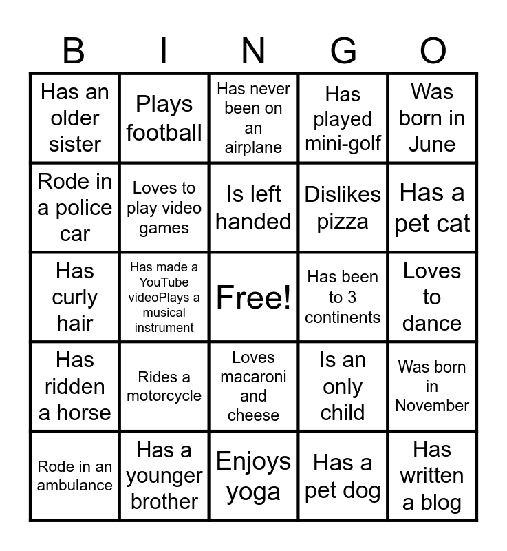 This bingo card has a free space and 24 words: Rides a motorcycle, Has a younger brother, Is left handed, Rode in an ambulance, Was born in June, Has an older sister, Rode in a police car, Plays football, Has been to 3 continents, Loves macaroni and cheese, Dislikes pizza, Has curly hair, Is an only child, Was born in November, Loves to play video games, Has a pet dog, Loves to dance, Has never been on an airplane, Has a pet cat, Has made a YouTube videoPlays a musical instrument, Has written a blog, Has ridden a horse, Has played mini-golf and Enjoys yoga.