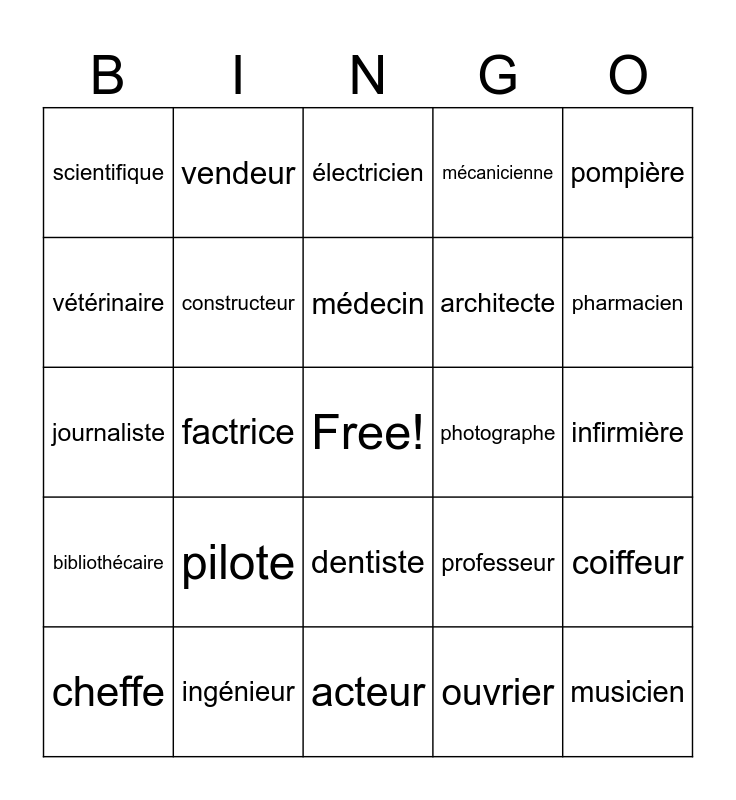 This bingo card has a free space and 39 words: artiste, auteur, boulangère, constructeur, cheffe, dentiste, médecin, agriculteur, pompière, bibliothécaire, factrice, mécanicienne, musicien, infirmière, photographe, pilote, policière, scientifique, soldate, professeur, vétérinaire, acteur, architecte, pharmacien, astronaute, plombière, agent immobilier, secrétaire, charpentière, vendeur, serveuse, conductrice, électricien, ingénieur, ouvrier, footballeur, coiffeur, journaliste and astronome.