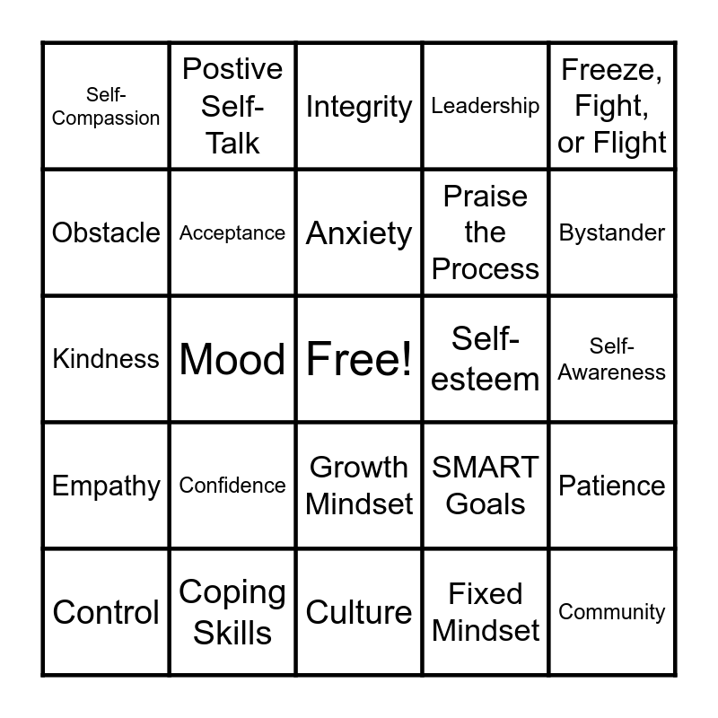 This bingo card has a free space and 26 words: Growth Mindset, Fixed Mindset, Anxiety, Coping Skills, Freeze, Fight, or Flight, Self-Compassion, Obstacle, Postive Self-Talk, Self-Awareness, SMART Goals, Praise the Process, Kindness, Patience, Control, Mood, Social Awareness, Leadership, Empathy, Integrity, Community, Bystander, Culture, Self-esteem, Confidence, Acceptance and Vulnerability.