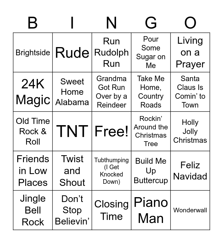 This bingo card has a free space and 58 words: Sweet Caroline, Don’t Stop Believin’, Livin’ on a Prayer, Friends in Low Places, Piano Man, Bohemian Rhapsody, Sweet Home Alabama, Brown Eyed Girl, Take Me Home, Country Roads, American Pie, Pour Some Sugar on Me, Jessie’s Girl, Summer of ’69, You Shook Me All Night Long, I Love Rock 'n' Roll, Brightside, Wonderwall, Living on a Prayer, Come On Eileen, Grandma Got Run Over by a Reindeer, Rockin’ Around the Christmas Tree, Run Rudolph Run, Jingle Bell Rock, Feliz Navidad, Blue Christmas, Holly Jolly Christmas, All I Want for Christmas Is You, Last Christmas, Santa Claus Is Comin’ to Town, I Will Survive, Don’t Stop Me Now, Lean On Me, My Girl, Respect, Ring of Fire, Born to Be Wild, Sharp Dressed Man, TNT, Old Time Rock & Roll, La Bamba, Twist and Shout, Shout, Build Me Up Buttercup, Love Shack, Footloose, Walking on Sunshine, Hey Ya!, Tubthumping (I Get Knocked Down), Closing Time, Take On Me, California Lovin, Buddy Holly, Call Me, Billie Jean, Rude, Louie Louie, 24K Magic and Walk This Way.