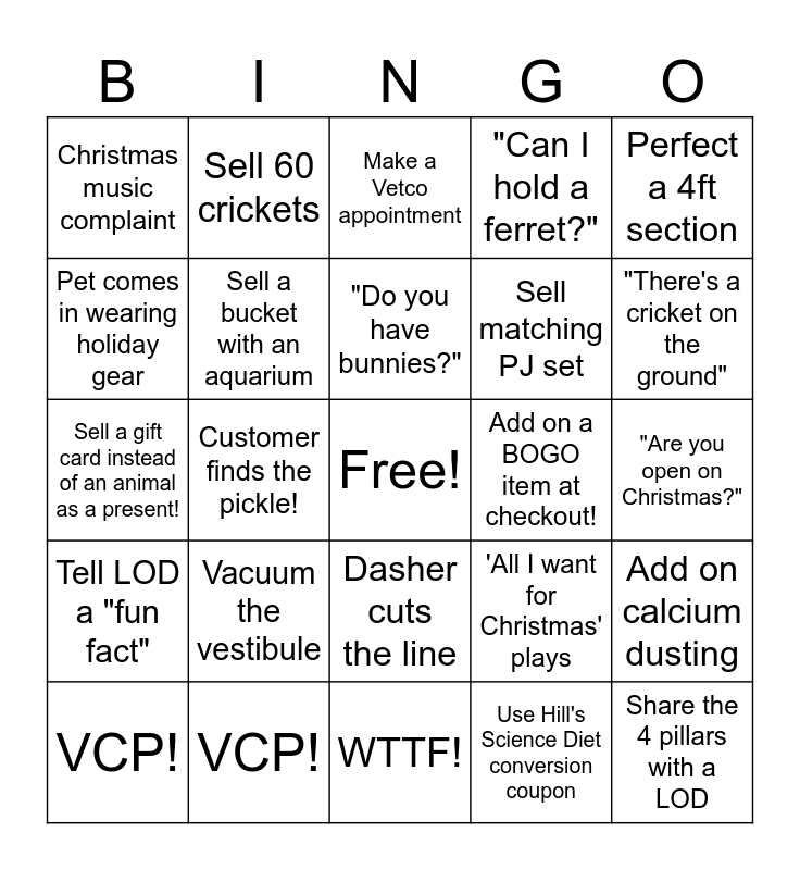 This bingo card has a free space and 29 words: VCP!, WTTF!, Customer finds the pickle!, Unlock grooming perk for guest in app, Christmas music complaint, Make a Vetco appointment, Sell a bucket with an aquarium, Vacuum the vestibule, Add on a BOGO item at checkout!, VCP!, "Are you open on Christmas?", Share the 4 pillars with a LOD, WTTF!, Use Hill's Science Diet conversion coupon, "There's a cricket on the ground", Add on a BOGO item at checkout!, Dasher cuts the line, Tell LOD a "fun fact", Perfect a 4ft section, Sell a gift card instead of an animal as a present!, 'All I want for Christmas' plays, "Are you open Christmas Eve?", Sell matching PJ set, Pet comes in wearing holiday gear, "Can I hold a ferret?", Sell 60 crickets, Add on calcium dusting, "Do you have bunnies?" and Sell a wish pets lollipop.