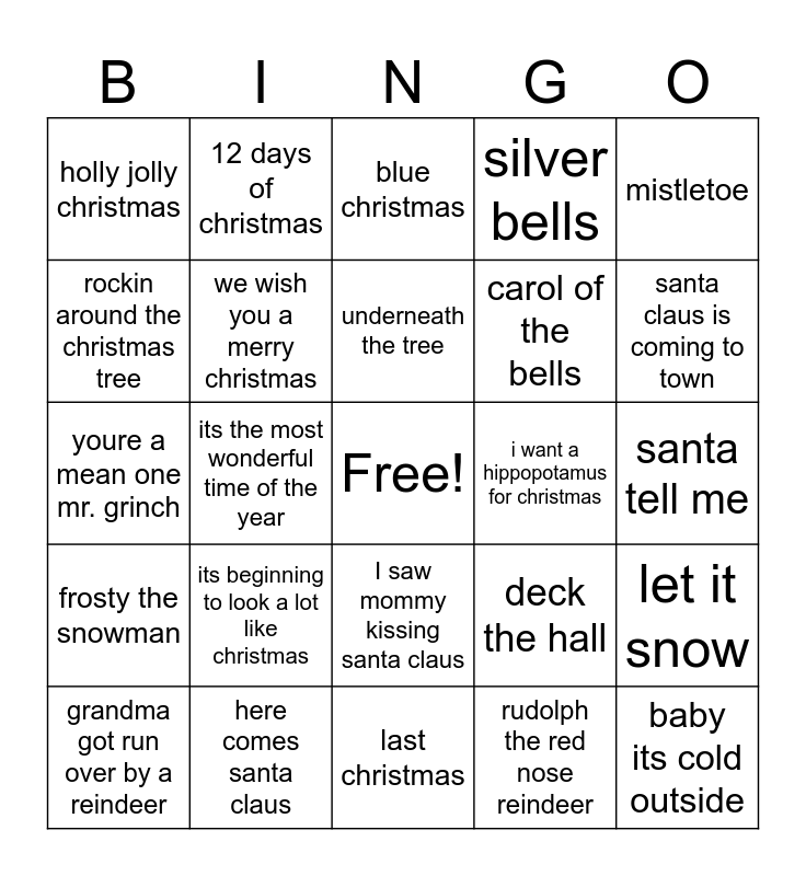 This bingo card has a free space and 24 words: its beginning to look a lot like christmas, here comes santa claus, underneath the tree, grandma got run over by a reindeer, mistletoe, holly jolly christmas, rockin around the christmas tree, 12 days of christmas, i want a hippopotamus for christmas, I saw mommy kissing santa claus, carol of the bells, youre a mean one mr. grinch, deck the hall, let it snow, we wish you a merry christmas, rudolph the red nose reindeer, santa tell me, blue christmas, santa claus is coming to town, its the most wonderful time of the year, baby its cold outside, frosty the snowman, silver bells and last christmas.
