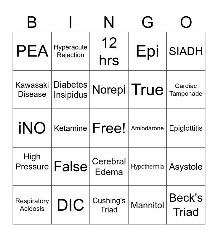 This bingo card has a free space and 34 words: Midazolam, Mannitol, Adenosine, Air Leak, High Pressure, Diabetes Insipidus, SIADH, Respiratory Acidosis, Hyperacute Rejection, Metabolic Acidosis, Norepi, 12 hrs, Ammonia, Tetralogy of Fallot, Amiodarone, Cardiac Tamponade, DIC, iNO, False, Hypothermia, Cerebral Edema, Fentanyl, PEA, Epiglottitis, Cushing's Triad, Beck's Triad, Epi, Lactate, True, Kawasaki Disease, Respiratory Alkalosis, Ketamine, Asystole and 24 hours.