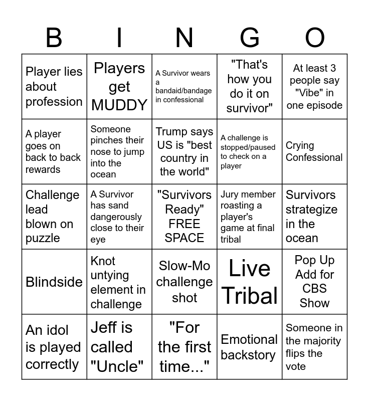 This bingo card has a free space and 29 words: An idol is played correctly, Jury member shocked 😲 at vote, A Survivor has sand dangerously close to their eye, Someone says "Final 3", Player lies about profession, A Survivor wears a bandaid/bandage in confessional, Someone pinches their nose to jump into the ocean, Knot untying element in challenge, Jury member roasting a player's game at final tribal, Jeff is called "Uncle", Survivors strategize in the ocean, Someone in the majority flips the vote, "For the first time...", Emotional backstory, Crying Confessional, Tribe says "we love you" to the player they just voted out, Slow-Mo challenge shot, Blindside, At least 3 people say "Vibe" in one episode, Challenge lead blown on puzzle, Live Tribal, Contestant voted out cries in their post-Tribal interview, A challenge is stopped/paused to check on a player, A player goes on back to back rewards, "That's how you do it on survivor", Players get MUDDY, Pop Up Add for CBS Show, Trump says US is "best country in the world" and Trump address eclipses 20 min.