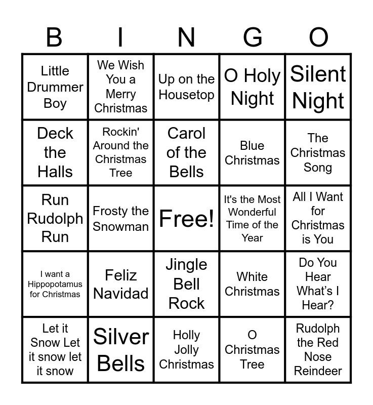 This bingo card has a free space and 26 words: Jingle Bell Rock, O Christmas Tree, Carol of the Bells, Silver Bells, Silent Night, Little Drummer Boy, Deck the Halls, We Wish You a Merry Christmas, All I Want for Christmas is You, White Christmas, Blue Christmas, Run Rudolph Run, Do You Hear What’s I Hear?, Let it Snow Let it snow let it snow, Frosty the Snowman, Jingle Bells, O Holy Night, I want a Hippopotamus for Christmas, Up on the Housetop, Rudolph the Red Nose Reindeer, The Christmas Song, Holly Jolly Christmas, It's the Most Wonderful Time of the Year, Feliz Navidad, Rockin' Around the Christmas Tree and Last Christmas.