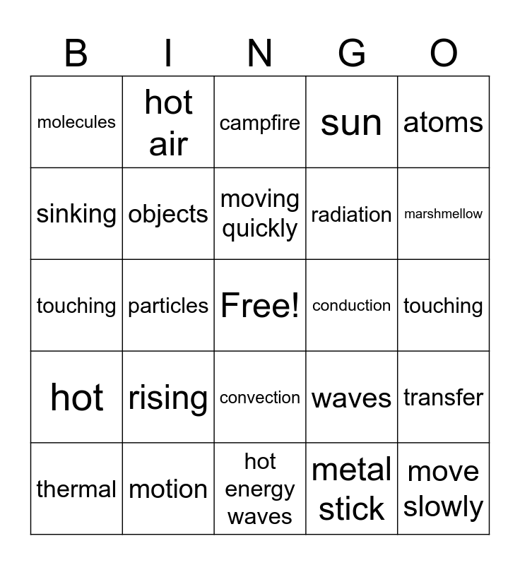 This bingo card has a free space and 24 words: rising, motion, moving quickly, thermal, atoms, molecules, sinking, hot air, conduction, convection, radiation, touching, waves, transfer, objects, metal stick, touching, campfire, marshmellow, particles, move slowly, hot, sun and hot energy waves.