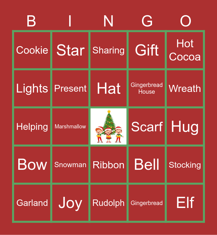 This bingo card has a free space and 48 words: Santa, Elf, Reindeer, Rudolph, Snowman, Snowflake, Star, Christmas Tree, Lights, Candy Cane, Present, Gift, Stocking, Bell, Jingle, Sleigh, Hat, Scarf, Mittens, Hot Cocoa, Marshmallow, Gingerbread, Cookie, Gingerbread House, Ornament, Wreath, Garland, Tinsel, Ribbon, Bow, Angel, Carol, Song, Music, Joy, Cheer, Smile, Hug, Friends, Family, Love, Kindness, Sharing, Giving, Helping, Thankful, Cozy and Fireplace.