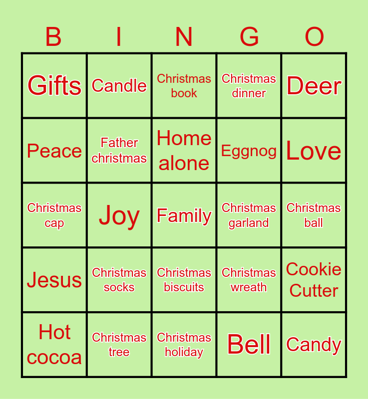 This bingo card has a free space and 44 words: Star, Christmas socks, Christmas songs, Bell, Christmas, Snow, Father christmas, Christmas lights, Christmas dinner, Candy, Gifts, Christmas tree, Christmas wreath, Christmas ball, Christmas angel, Sled, Christmas holiday, Christmas garland, Skate, Christmas cap, Candle, Christmas biscuits, Christmas market, Deer, movie, Holiday, Home alone, Candle, Cookie Cutter, Hot cocoa, Christmas Tree, Christmas book, Nativity, Bible, Jesus, Joseph, Mary, Manger, Love, Peace, Joy, Songs, Eggnog and Goodwill.