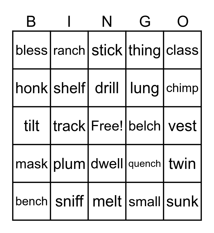 This bingo card has a free space and 34 words: grass, small, staff, fresh, mask, shelf, class, bench, ranch, still, drill, stick, shred, gulp, belch, chimp, sniff, tilt, plum, quench, dwell, throb, bless, vest, melt, sunk, thing, thank, lung, honk, dress, track, twin and sand.