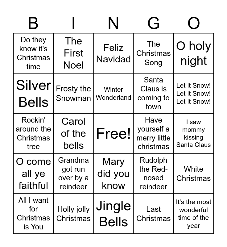 This bingo card has a free space and 29 words: All I want for Christmas is You, Blue Christmas, Carol of the bells, Deck the halls, Do they know it's Christmas time, Feliz Navidad, Frosty the Snowman, Grandma got run over by a reindeer, Have yourself a merry little christmas, Holly jolly Christmas, I saw mommy kissing Santa Claus, It's the most wonderful time of the year, Jingle Bells, Last Christmas, Let it Snow! Let it Snow! Let it Snow!, Little Drummer Boy, Mary did you know, O come all ye faithful, O holy night, Rockin' around the Christmas tree, Rudolph the Red-nosed reindeer, Santa Baby, Santa Claus is coming to town, Silver Bells, The Christmas Song, The First Noel, White Christmas, Winter Wonderland and Wonderful Christmas Time.
