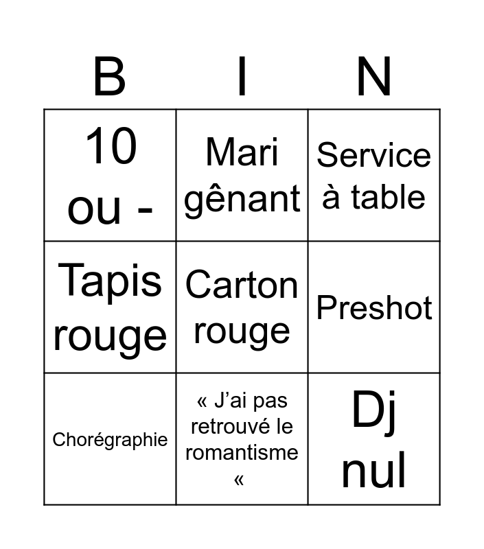 This bingo card has a free space and 8 words: Preshot, Service à table, Mari gênant, Chorégraphie, 10 ou -, Dj nul, Tapis rouge and « J’ai pas retrouvé le romantisme «.