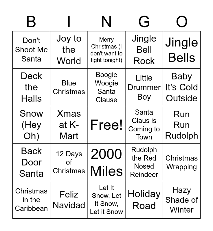 This bingo card has a free space and 69 words: Christmas in Hollis, Run Run Rudolph, I Have A Little Dreidel, Th Chanukah Song, Feliz Navidad, I Want a Hippopotamus For Christmas, Jingle Bell Rock, Last Christmas, Jingle Bells, Oh Hanukkah, Christmas Wrapping, Candy Cane Children, Don't Shoot Me Santa, Merry Christmas (I don't want to fight tonight), Winter Wonderland, Xmas at K-Mart, 2000 Miles, Little Drummer Boy, Santa Jenny 867-5309, Back Door Santa, Santa Claus is Coming to Town, Rudolph the Red Nosed Reindeer, Baby It's Cold Outside, Rockin' Around the Christmas Tree, Ths Christmas, Frosty the Snowman, Christmas,(Baby Please Come Home), Holiday Rock, Holiday Road, Last Christmas, Joy to the World, You're A Mean One Mr. Grinch, Here Comes Santa Claus, Oi To The World, Funky, Funky, Xmas, Santa Baby, Sleigh Ride, Do They Know It's Christmas, Deck the Halls, It's Beginning To Look A Lot Like Christmas, 12 Days of Christmas, Hazy Shade of Winter, Reggae Christmas, The Chanukah Song Part 3, Rock and Roll Christmas, Christmas in the Caribbean, I Saw Mommy Kissing Santa Claus, Grandma Got Run Over By A Reindeer, Christmas All Over Again, Blue Christmas, Boogie Woogie Santa Clause, Christmas at the Zoo, Christmas Eve/Sarajevo 12/24, Let It Snow, Let It Snow, Let it Snow, A Long December, Ice Ice Baby, It's the Most Wonderful Time of the Year, Merry Christmas Darling, Cold As Ice, Snow (Hey Oh), Velvet Snow, My Only Wish (This Year), O Come All Ye Faithful, The Chipmunk Song (Christmas Don't Be Late), Father Christmas, Mistletoe, Fairytale of New York, Christmas Saves the Year and The Lonely Jew on Christmas.