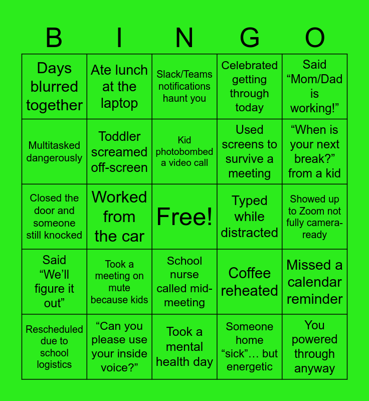This bingo card has a free space and 24 words: Took a meeting on mute because kids, “Can you please use your inside voice?”, Kid photobombed a video call, Rescheduled due to school logistics, Said “Mom/Dad is working!”, Days blurred together, Multitasked dangerously, Ate lunch at the laptop, Typed while distracted, School nurse called mid-meeting, Used screens to survive a meeting, Closed the door and someone still knocked, Coffee reheated, Missed a calendar reminder, Toddler screamed off-screen, Someone home “sick”… but energetic, Showed up to Zoom not fully camera-ready, Slack/Teams notifications haunt you, “When is your next break?” from a kid, Worked from the car, You powered through anyway, Said “We’ll figure it out”, Celebrated getting through today and Took a mental health day.