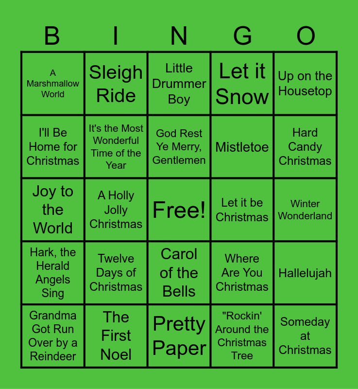 This bingo card has a free space and 79 words: White Christmas, Rudolph the Red-Nosed Reindeer, Little Drummer Boy, Do You Hear What I Hear?, The Chipmunk Song, Here Comes Santa Claus, Have Yourself a Merry Little Christmas, Silent Night, It's Beginning to Look a Lot Like Christmas, Jingle Bells, Blue Christmas, Santa Claus is Coming to Town, Let it Snow, A Marshmallow World, I Saw Mommy Kissing Santa Claus, I'll Be Home for Christmas, We Wish You a Merry Christmas, Twelve Days of Christmas, All I want for Christmas is You, Winter Wonderland, Baby It's Cold Outside, Up on the Housetop, Joy to the World, God Rest Ye Merry, Gentlemen, It's the Most Wonderful Time of the Year, This Christmas, Silver Bells, Santa Looked a Lot Like Daddy, Deck the Halls, Frosty the Snowman, Hard Candy Christmas, O Holy Night, Pretty Paper, Rockin' Around the Christmas Tree, Grandma Got Run Over by a Reindeer, Let it be Christmas, All I Want for Christmas is You, Christmas Cookies, Jingle Bell Rock, Someday at Christmas, Please Come Home for Christmas, Run Run Rudolph, You're a Mean One, Mr. Grinch, Little Saint Nick, Feliz Navidad, Sleigh Ride, Merry Christmas, Happy Holidays, Last Christmas, What Christmas Means to Me, Santa Tell Me, Hallelujah, A Holly Jolly Christmas, Where Are You Christmas, Underneath the Tree, It Came Upon a Midnight Clear, How Great Thou Art, I'm Gettin' Nuttin for Christmas, All I Want for Christmas is my Two Front Teeth, Away in a Manger, Carol of the Bells, Mistletoe, Mary, Did You Know?, The Man with all the Toys, Santa Baby, Run, Run Santa, Santa Can You Hear Me, Christmas Time is Here, O Christmas Tree, Merry Christmas Baby, Hark, the Herald Angels Sing, The First Noel, Every Year, Every Christmas, Happy Holidays, Christmas Ain't Christmas (Without the One You Love), Who Took the Merry Out of Christmas, "Rockin' Around the Christmas Tree, "Gee Whiz, It's Christmas", Go Tell It on the Mountain and O Come, All Ye Faithful".