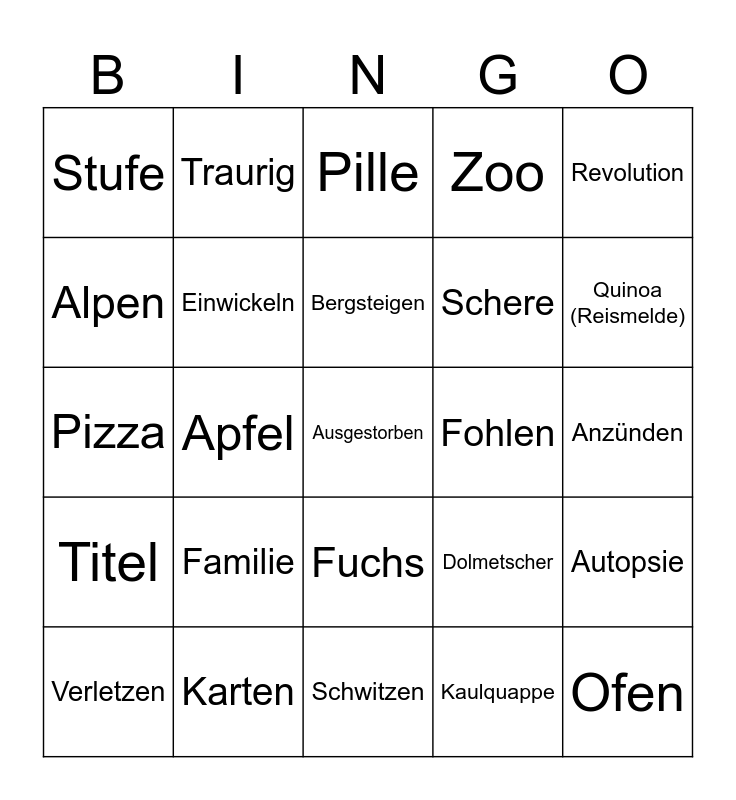This bingo card has a free space and 24 words: Familie, Karten, Bergsteigen, Verletzen, Revolution, Stufe, Alpen, Traurig, Fohlen, Fuchs, Schere, Pizza, Dolmetscher, Autopsie, Einwickeln, Kaulquappe, Anzünden, Pille, Quinoa (Reismelde), Apfel, Ofen, Titel, Zoo and Schwitzen.
