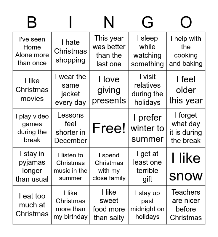 This bingo card has a free space and 24 words: I listen to Christmas music in the summer, I like Christmas more than my birthday, I love giving presents, I eat too much at Christmas, I help with the cooking and baking, I've seen Home Alone more than once, I like Christmas movies, I hate Christmas shopping, I prefer winter to summer, I spend Christmas with my close family, I visit relatives during the holidays, I play video games during the break, I get at least one terrible gift, I like snow, I wear the same jacket every day, I stay up past midnight on holidays, I forget what day it is during the break, This year was better than the last one, I feel older this year, Lessons feel shorter in December, Teachers are nicer before Christmas, I stay in pyjamas longer than usual, I sleep while watching something and I like sweet food more than salty.