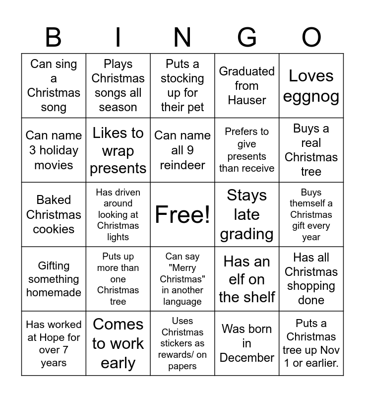 This bingo card has a free space and 42 words: Celebrated Christmas in another country, Can name all 9 reindeer, Loves candy canes, Puts up more than one Christmas tree, Was born in December, Has all Christmas shopping done, Puts a Christmas tree up Nov 1 or earlier., Decorated a gingerbread house, Puts a stocking up for their pet, Can say "Merry Christmas" in another language, Buys themself a Christmas gift every year, Buys a real Christmas tree, Has driven around looking at Christmas lights, Loves eggnog, Doesn't like Christmas, Has an elf on the shelf, Sat on Santa's lap this year, Baked Christmas cookies, Has a theme for their Christmas tree, Plays Christmas songs all season, Can name 3 holiday movies, Goes caroling, Leaves their Christmas tree up through January, Can sing a Christmas song, Has not finished Christmas shopping, Has had a holiday drink from Starbucks, Prefers to give presents than receive, Is wearing festive socks, Can laugh like Santa, Can name 5 Christmas songs, Has received a pet as a Christmas present, Gifting something homemade, Likes to wrap presents, Uses Christmas stickers as rewards/ on papers, Enjoys a cold recess duty, Has worked at Hope for over 7 years, Comes to work early, Stays late grading, Always brings lunch from home, Decorated your classroom for Christmas, Graduated from Hauser and Has a classroom elf.