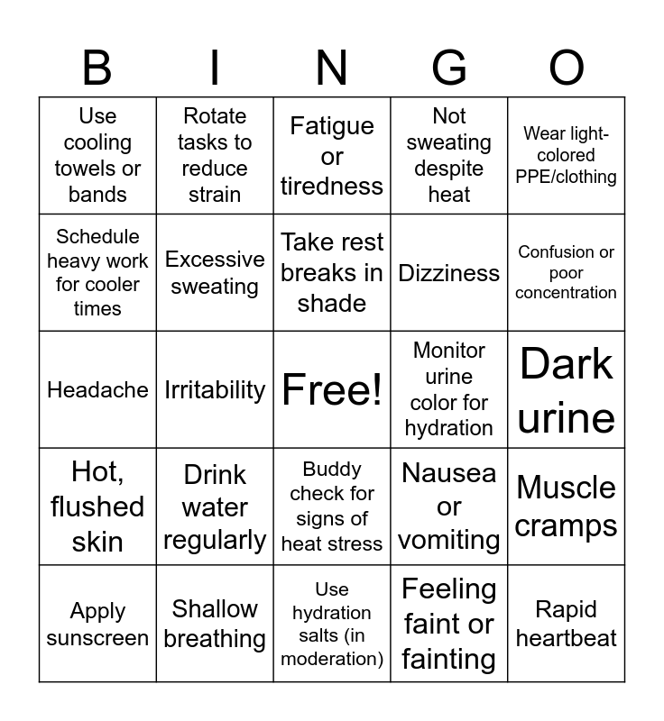 This bingo card has a free space and 25 words: Drink water regularly, Use hydration salts (in moderation), Take rest breaks in shade, Apply sunscreen, Wear light-colored PPE/clothing, Use cooling towels or bands, Schedule heavy work for cooler times, Rotate tasks to reduce strain, Monitor urine color for hydration, Buddy check for signs of heat stress, Dizziness, Headache, Nausea or vomiting, Muscle cramps, Excessive sweating, Dry mouth, Dark urine, Fatigue or tiredness, Confusion or poor concentration, Irritability, Rapid heartbeat, Shallow breathing, Hot, flushed skin, Not sweating despite heat and Feeling faint or fainting.