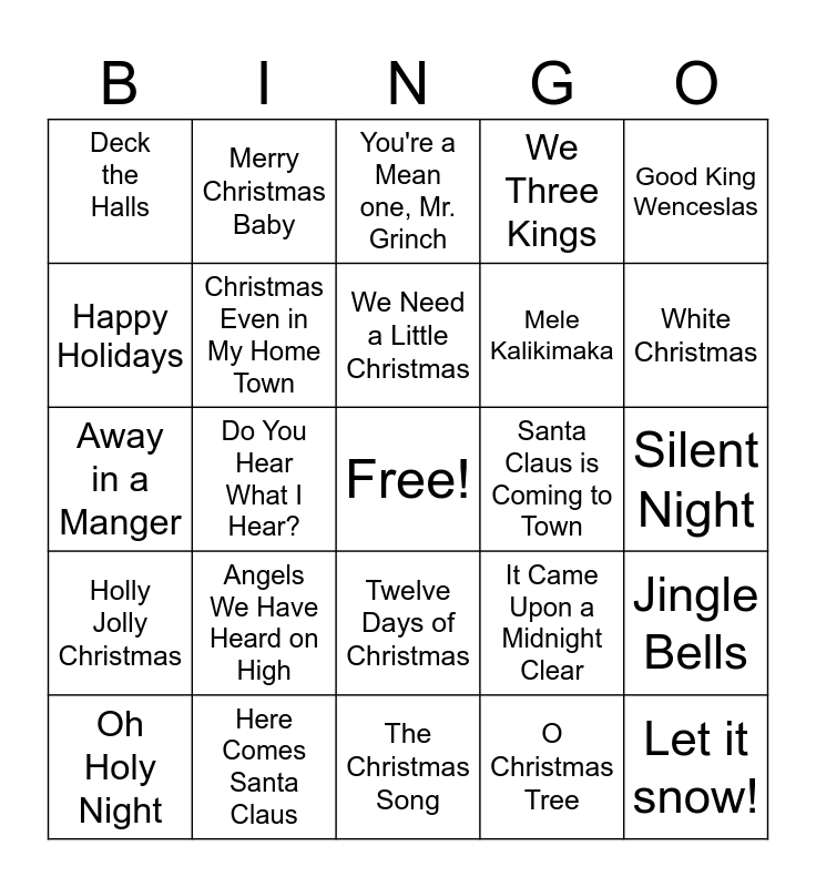 This bingo card has a free space and 24 words: Angels We Have Heard on High, Here Comes Santa Claus, We Need a Little Christmas, Oh Holy Night, Good King Wenceslas, Deck the Halls, Happy Holidays, Merry Christmas Baby, Santa Claus is Coming to Town, Twelve Days of Christmas, Mele Kalikimaka, Away in a Manger, It Came Upon a Midnight Clear, Jingle Bells, Christmas Even in My Home Town, O Christmas Tree, Silent Night, You're a Mean one, Mr. Grinch, White Christmas, Do You Hear What I Hear?, Let it snow!, Holly Jolly Christmas, We Three Kings and The Christmas Song.